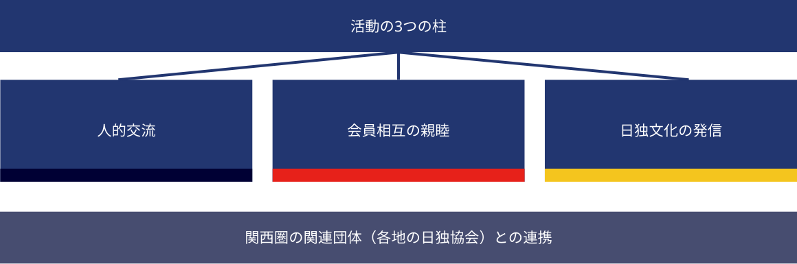 (3)市民レベルでの「絆づくり」と発信力強化:会員間ネットワークを活かし、大阪・関西を拠点に日独両国市民が交流を深め、相互理解を促進するとともに、その活動を社会に発信し、大阪・関西万博の精神を活かし、関西から国際社会へとつながる架け橋としての役割を担います。また、協会定款にもある「一般市民へのドイツ文化普及およびドイツに向けた日本文化発信」(第4条)にも努めてまいります。