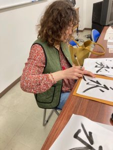 初日の3月8日は、グリーンワルド財団の奨学生として2月から5月まで日本に滞在されているアントニア・カミューラさんが参加されました。ご両親は、日本に造詣が深く、ご両親とも日本語が堪能という環境のためか書道にも大変関心を持たれています。筆を持つのも全く初めてということで、最初は講師から筆、紙、墨、硯などの道具について説明があり、早速練習に入りました。