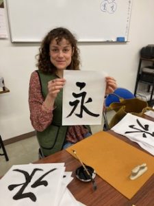 最初は、一とか十のような簡単なものを書かれていたのですが、永という文字には筆で書く要素が詰まっているということで「永」の練習に入りました。一生懸命練習されたのともともと書の才能がおありの様で、練習の終わりには全く初めてとは思えない素晴らしい出来栄えの文字を書かれていました。緊張もされたようですが、最後は楽しまれたようです。これも日本の文化をドイツの方に紹介する一環です。(事務局・和田)