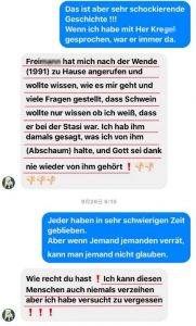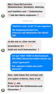 私と友人のM.F氏のやり取りの一部を紹介する。温厚な友人はIMの通訳を豚Schwein、人間の屑Abschaum、最悪Schlimmsten、狡猾Cleverstenといった、激しい辛辣な言葉を使って非難した。壁崩壊後シュタージやIMのメンバーが暴かれることによって、友人関係や夫婦関係が壊れる話を聞いた。
