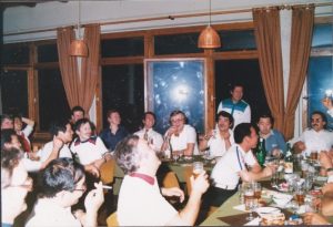 パーティで3人楽しく乾杯(1988年)中央に立っているのが私、写真の私の左隣が友人、右隣ネクタイが通訳のシュタージM(非公式協力者)