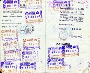 私は出張で日本から東ドイツへ向かう際は成田からアンカレッジ空港で乗り継いで西ドイツ空港経由でテーゲル空港に入った。南回りの東南アジア、中東経由よりは時間短縮できたが遠回りの無駄な時間を費やした。当時のソ連上空は西側の飛行機は飛ぶことができなかった。またテーゲルへの便はルフトハンザ航空便は利用できず米英便を使った。テーゲル空港はソ連邦による西ベルリン封鎖時に49日で滑走路工事が完了し、米国を主体とする空輸作戦「空の架け橋」に供され、大量の物資を受け入れたドイツ分断の象徴的な空港である。西ベルリンから東ベルリンへの移動は面倒であった。車、徒歩で国境を超える際はチェックポイントチャーリーを、列車の場合はフリードリヒシュトラーセ駅の検問所を利用した。“東ドイツの近代化に寄与する日本人のスーパーバイザー”でもあったので出張の度に期間限定のビザと滞在許可書をもらっていた。検問所ではそれらの書類とスーパーバーザ証明書、パスポート、旅行者集計カード(Zählkarte)を提出し、現地通貨マルクをドイツマルクで両替した。東ドイツマルクは持ち出し、持ち込み禁止であったが、フリードリヒ駅の西側高架脇の両替屋ではドイツマルクと1:5~10の換金率で購入できた。東ドイツ検問所で1:1で東マルクとの交換が入国の条件なのは外貨特にハードカレンシーのドイツマルクを獲得するためであった。フリードリヒの迷路のような検問所では、順番待ちの後“ジー”という音と共に開錠されるので自分で扉を開けてブースに入る。一段高いところに国境管理係官がいて入国者を審査している。そこは閉ざされた個室で、威圧的な大男の係官が数名いて私の挙動と書類と交互にチェックする。緊張する。よく見ると壁に鏡が掛けてあって死角になっている私の手荷物が係官から見えるようになっている。検問所の出国時はさらに緊張する。チェックポイントチャーリーでは、国境警察が犬を連れて出国者の車の周りをぐるぐる回り、トランク、エンジンルームだけでなく後部座席も外してみている。運搬用のキャリーの先に鏡をつけて車体の底を見ている。滞在中に、検問所のゲートのバーより低い改造車で突破しようとして銃撃を受けた話などをきいたので、検問所では極度に緊張した。30年たったいまでもあの扉の“ジー”という音は忘れることはできない。税関ではときどき入出国者が別室へ連れていかれた。国境管理はハード、ソフトとも厳重で完璧であった。これ以外にも東西ドイツ間の1400Kmに及ぶ国境には、モノが動くとセンサーが感知し、動いているモノに射撃する自動発射装置が3万基以上設置されていたとされる。このように東独は国境に、特に自国民の監視に膨大な投資をしていた。