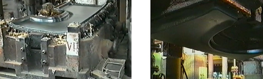 加圧時に200度前後に加熱保持、その後加圧は解放。その後再度加圧、加熱される。このサイクルが4度繰り返され最後に90℃に強制冷却されて樹脂の硬化(濃い茶色に変色)と形状成形が終わる。加工荷重は約400トンで加工時間は10分を要する。